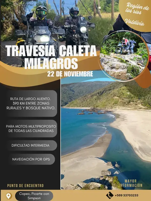 Prepárate para vivir una experiencia única con la Travesía Caleta Milagros, una ruta de largo aliento que recorre más de 390 km entre zonas rurales, senderos y el imponente bosque nativo del sur de Chile. Diseñada para motos multipropósito de todas las cilindradas, esta aventura de dificultad intermedia combina naturaleza, técnica y espíritu de exploración, guiada completamente por navegación GPS. Una travesía ideal para quienes buscan desafiarse y disfrutar de los paisajes más auténticos de la Región de Los Ríos.