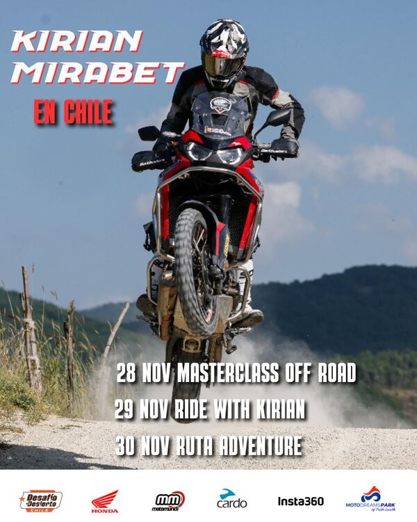 ¡El reconocido piloto internacional Kirian Mirabet llega a Chile para vivir tres jornadas inolvidables junto a la comunidad off road! Prepárate para una experiencia completa que incluye una masterclass de técnica off road, una salida exclusiva para rodar junto a Kirian y una imperdible ruta adventure para llevar tus habilidades al siguiente nivel.Un encuentro único donde podrás aprender, practicar y disfrutar de la adrenalina del trail.
