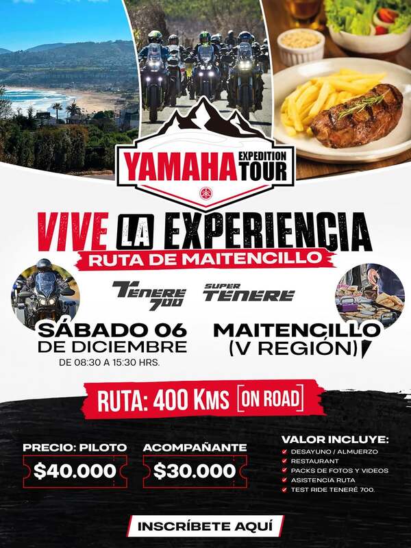 Una travesía de 400 km completamente on road, diseñada para disfrutar del camino, los paisajes costeros y la experiencia de rodar en comunidad.El evento incluye desayuno, almuerzo, restaurante, asistencia en ruta, packs de fotos y videos para recordar cada momento, y la opción de realizar un emocionante test ride de la Ténéré 700. Una salida perfecta para quienes buscan aventura, compañerismo y la calidad que distingue a Yamaha.