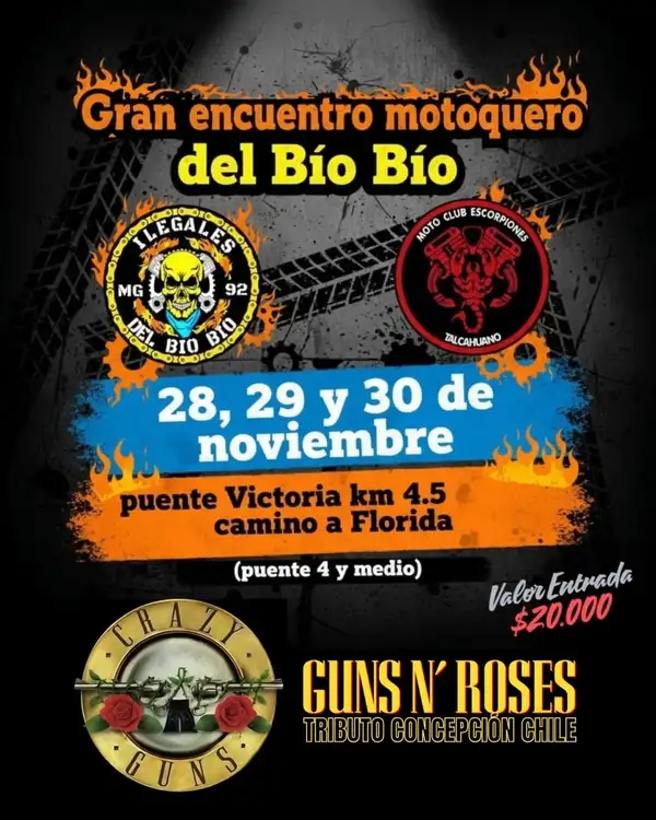 El Gran Encuentro Motoquero del Bío Bío reúne a los apasionados del motociclismo en una celebración cargada de energía, camaradería y música en vivo. Un evento creado para disfrutar entre riders, clubes y familias, con actividades que harán vibrar a todos los asistentes. Además, contará con un espectacular tributo a Guns N’ Roses, que encenderá el ambiente con los clásicos más icónicos del rock.
