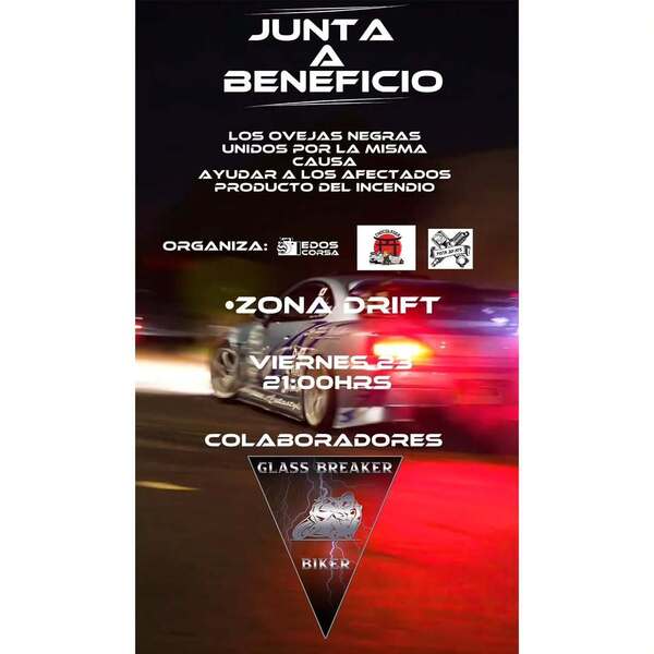 Únete a una noche donde la pasión por el asfalto se une a la solidaridad. "Los Ovejas Negras" y un gran equipo de colaboradores te invitan a una exhibición épica de Zona Drift con un objetivo fundamental: ir en ayuda de los afectados por los incendios. Ven a disfrutar de la destreza al volante y del mejor ambiente automotriz, demostrando que nuestra comunidad es más fuerte cuando se une por una causa.