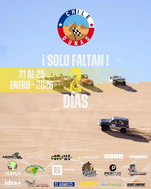 La arena nos espera y los motores ya rugen. Prepárate para vivir la experiencia off-road definitiva en un escenario único, donde la potencia de los 4x4 y la inmensidad de las dunas se encuentran. Únete a esta aventura épica diseñada para los amantes de la velocidad y el desafío extremo en pleno corazón del desierto. ¡Siente la adrenalina y prepárate para conquistar el terreno!
