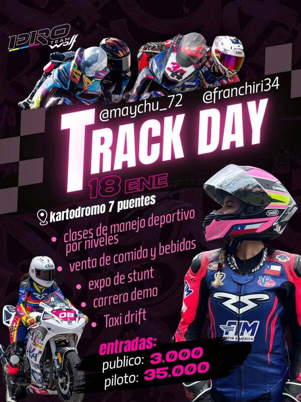 Vive una jornada cargada de adrenalina en el Track Day, un evento pensado para los amantes de las motos y la conducción deportiva. Disfruta de clases de manejo por niveles, comparte pista con pilotos destacados, y sé parte de una experiencia completa que incluye expo stunt, carrera demo, taxi drift y un ambiente ideal para toda la comunidad motera
