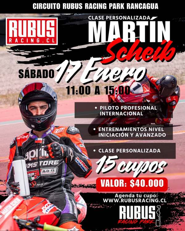 Vive una experiencia de alto nivel en pista con una clase personalizada en el circuito Rubus Racing Park, guiada por Martín Scheib, piloto profesional de trayectoria internacional. Una jornada pensada para riders que buscan perfeccionar su técnica, ganar confianza y llevar su manejo al siguiente nivel, tanto en nivel iniciación como avanzado. Cupos limitados para asegurar un entrenamiento realmente personalizado, enfocado en control, trazadas, frenado y rendimiento real en circuito