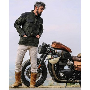 Presentamos la Bunker Jacket, una chaqueta de 3/4 de longitud inspirada en las primeras chaquetas militares y de motociclista. Esta resistente chaqueta esta confeccionada con lona humeda que repele el agua y reforzada con Cordura 100 % poliester en las zonas mas susceptibles a las caidas.