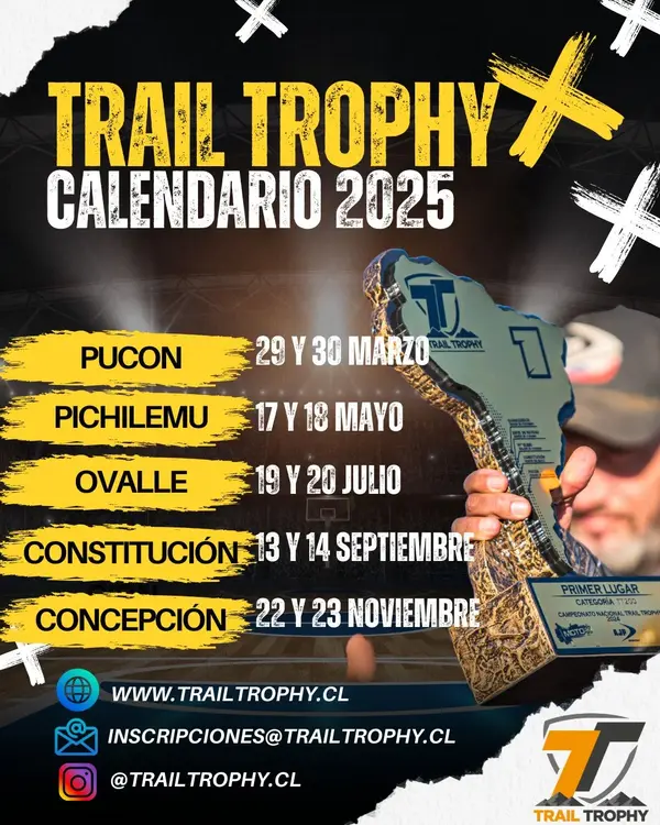¡Prepárate para vivir la experiencia del motociclismo multipropósito en su máxima expresión! El Trail Trophy 2025 te invita a recorrer los paisajes más impresionantes de Chile, poniendo a prueba tus habilidades de conducción y navegación en un desafío único. ¡Elige tu destino y únete a la aventura!